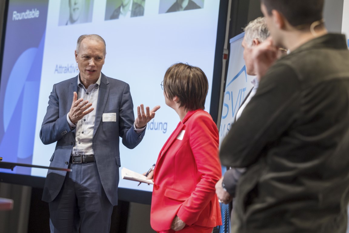 Als Referenten wagten Jan-Egbert Sturm, Professor für Angewandte Wirtschaftsforschung und Direktor der Konjunkturforschungsstelle der ETH Zürich, Markus Streckeisen, Unternehmer, Verwaltungsrat, Strategieberater und Studienleiter Real Estate Management an der Hochschule für Wirtschaft Zürich, sowie Yannick Blättler, Unternehmer, Kreativkopf, Podcaster und Speaker den Blick in die Zukunft und waren sich als Experten – gerade auch mit Blick auf die Generation Z – einig: Dem Fachkräftemangel muss in erster Linie mit einer Kombination von interessanten Berufsbildern, zeitgemässen Arbeitsbedingungen und gezieltem Einsatz von Technologie und damit einer Steigerung der Effizienz begegnet werden.